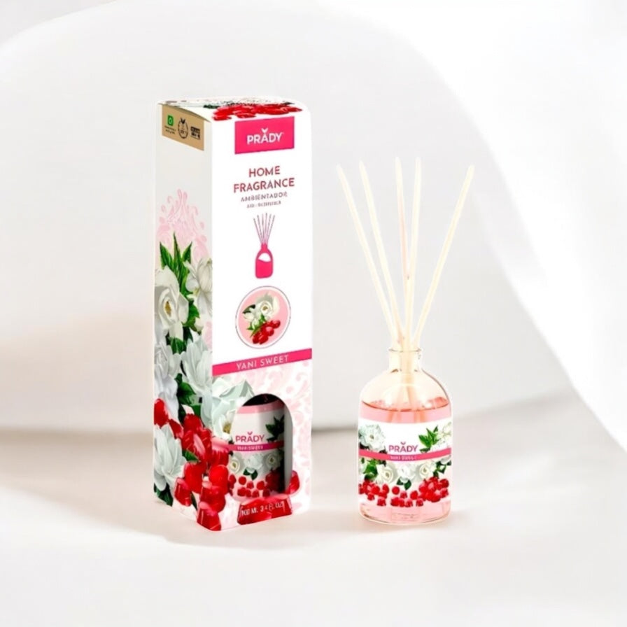 Avec ses bâtonnets, il diffuse en continu la senteur irrésistible de Yani Sweet : un parfum doux, fruité et réconfortant, qui rappelle les friandises de l’enfance.