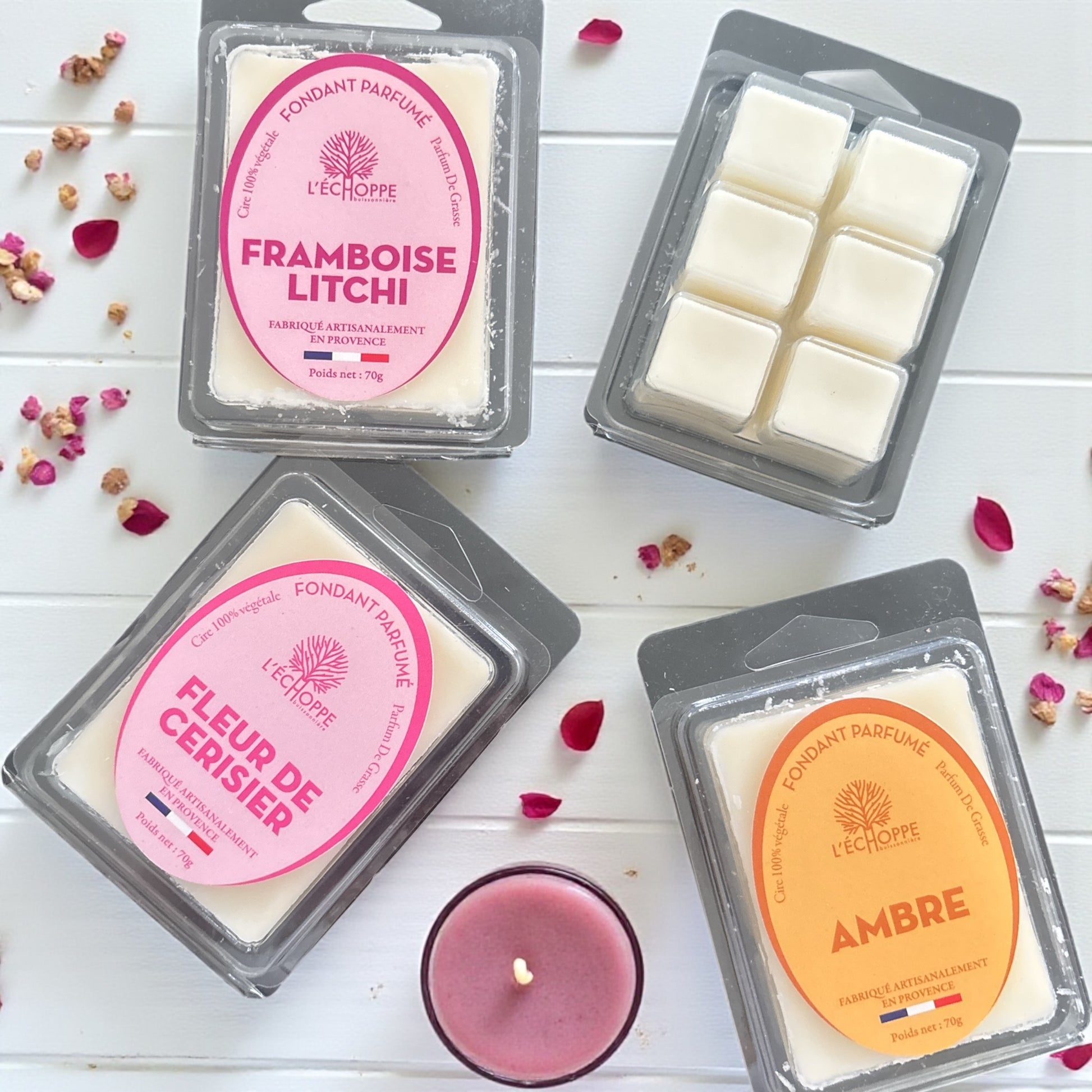 Laissez-vous séduire par ces fondants parfumés de 70 g, fabriqués à la main en Provence. Composés de cire végétale de soja, ils fondent lentement et diffusent un parfum raffiné, élaboré à Grasse, sans additifs toxiques.